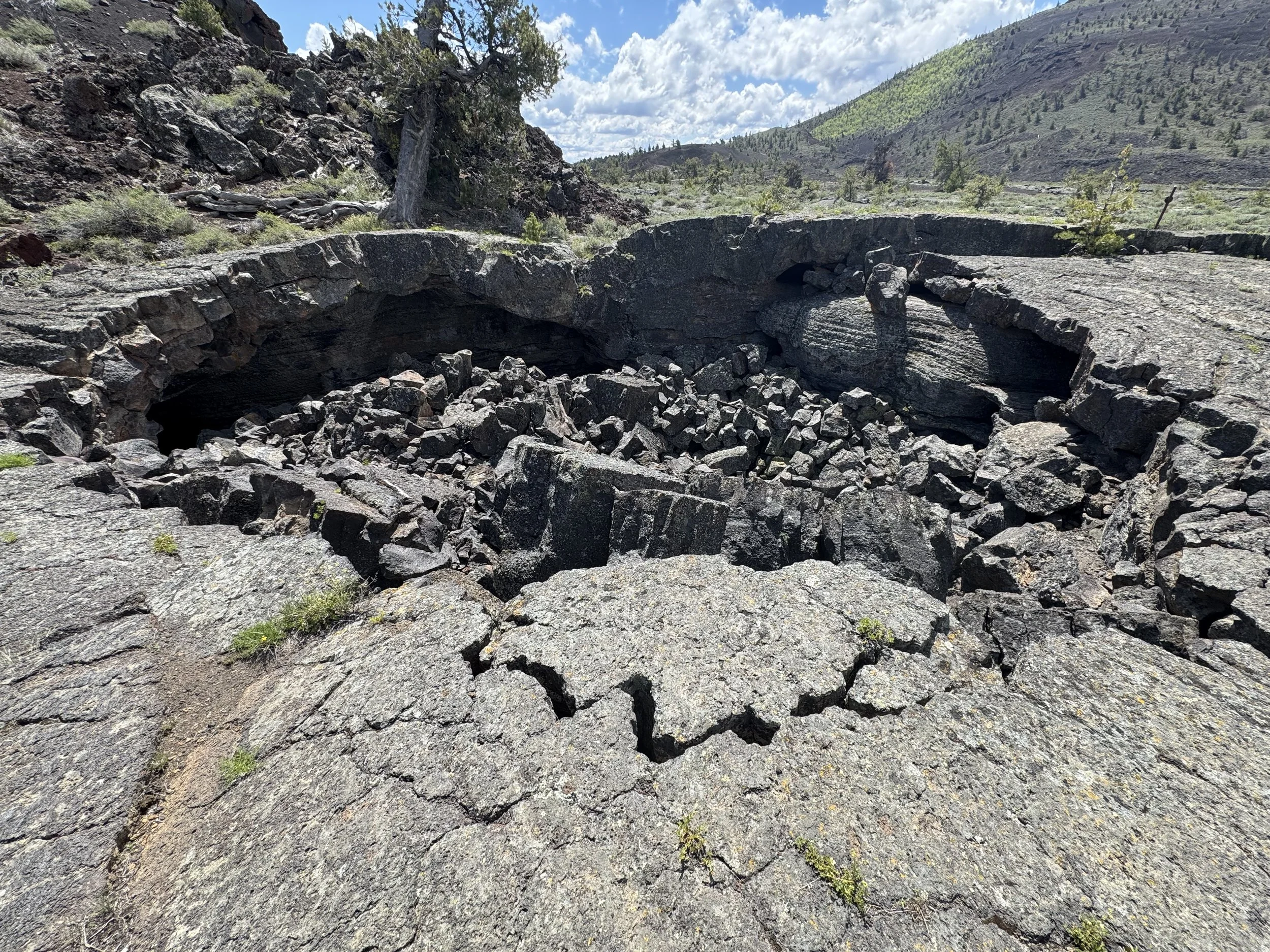 Our last hike in the park was Broken Top. This trail wrapped around a small mound, revealing views of all the various types of lava flows in the park. It was the most interesting hike we took. It ended at the Broken Top section—a large, hardened lava area that had collapsed, exposing fascinating caves and lava tubes. While we weren’t allowed to enter the caves (to protect the bats), if you know me, you know I peeked!